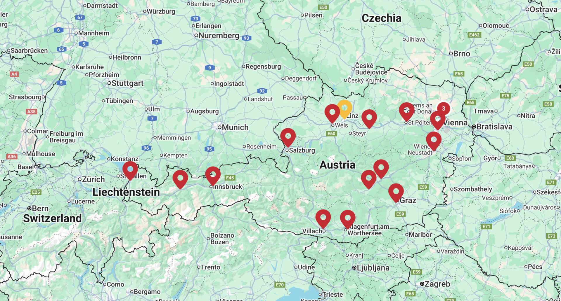 Finden Sie alle 18 HANSA-FLEX Niederlassungen in Österreich – mit Schlauchfertigung, Ersatzteilen, Hydraulik-Service, Sofortreparaturen und mobilem 24/7-Notdienst.